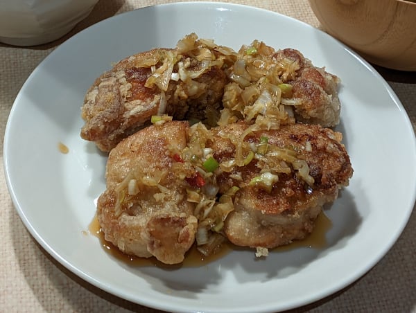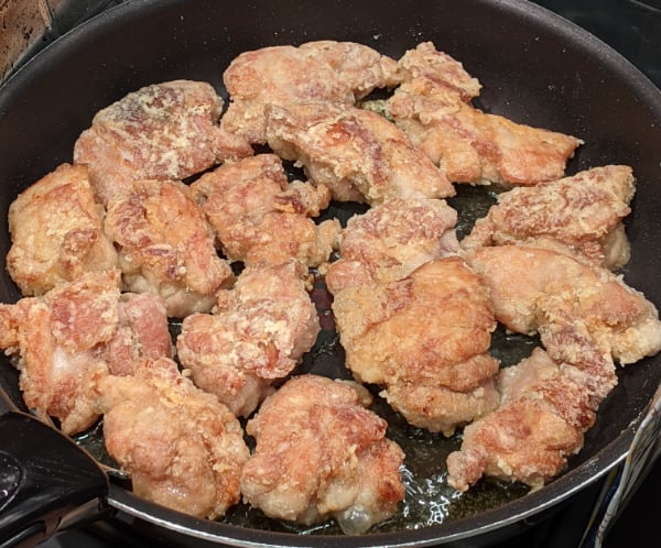 - 鶏肉に片栗粉をよくまぶし、フライパンに入れて揚げる