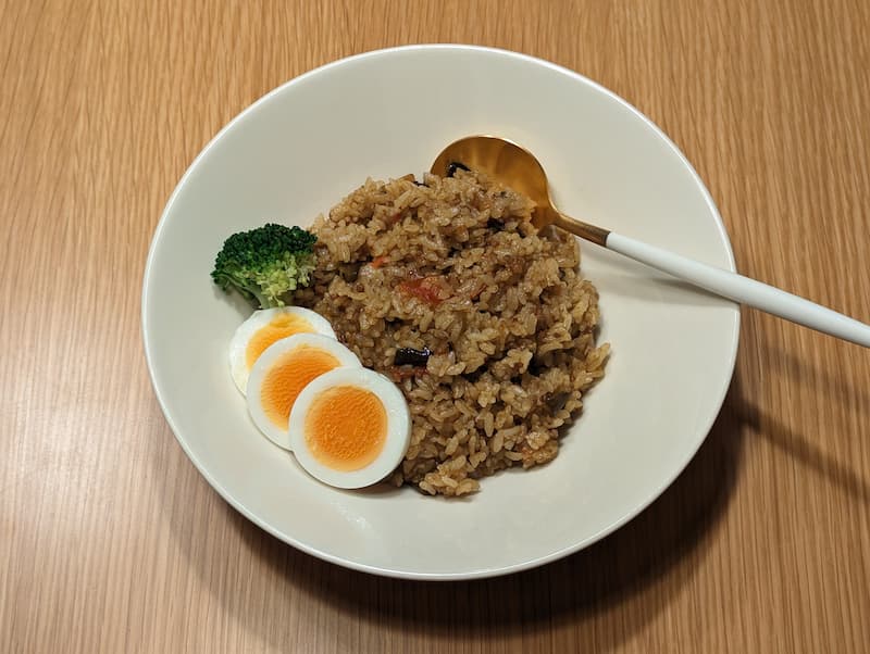 - カレーパウダー小さじ1とカレーを入れて、ご飯にカレーが絡まるまで炒める