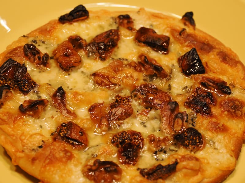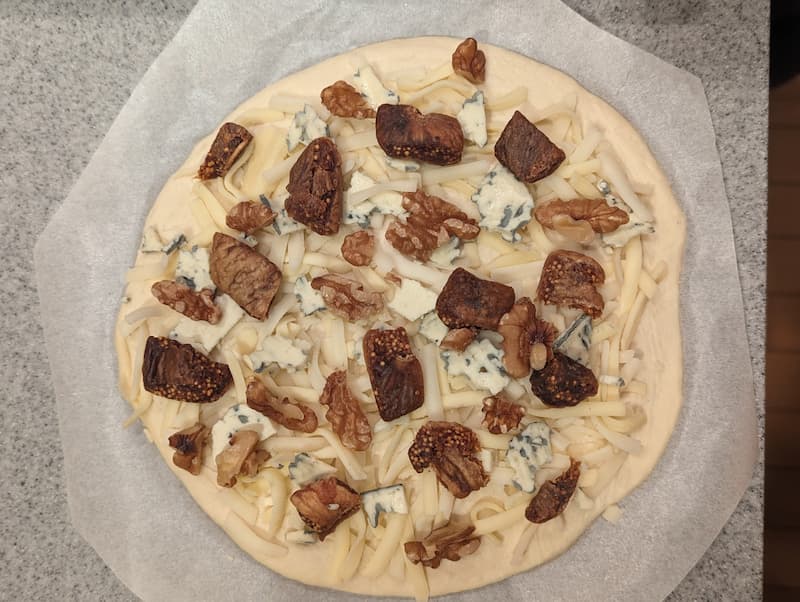 - ピザチーズを生地が見える程度の量で敷き詰める。多すぎるとゴルゴンゾーラの味が消える