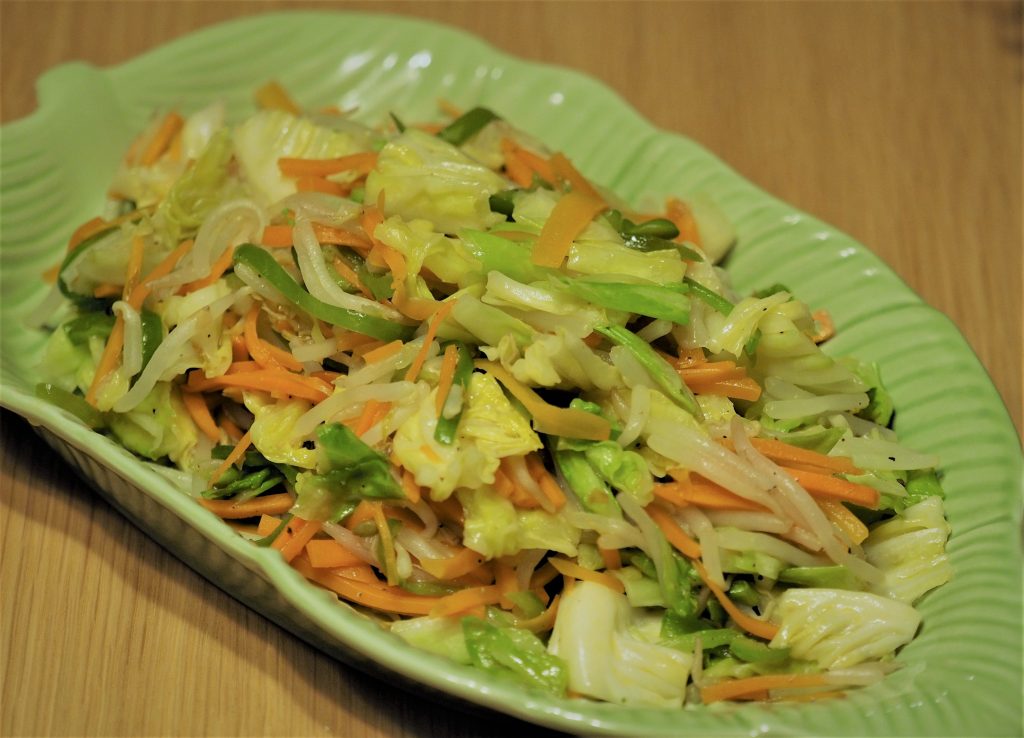あとは野菜炒めのセオリーに従って根菜系を先に炒めて火を通し、人数が多き場合には、キャベツやもやしなどの水分を多く含むものを投入したときに中火ではなく強火で一気に炒めることですかね。