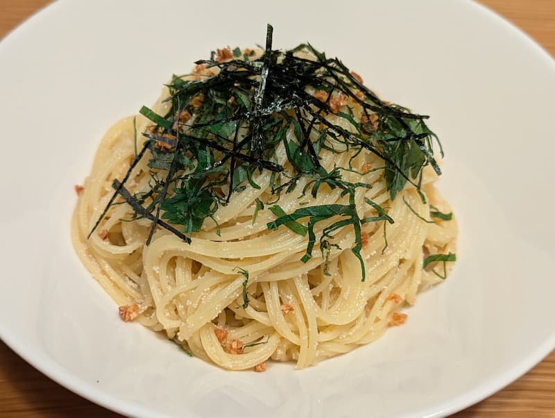 - フライパンの真ん中を開け、バターを入れて溶かし、麺と混ぜる