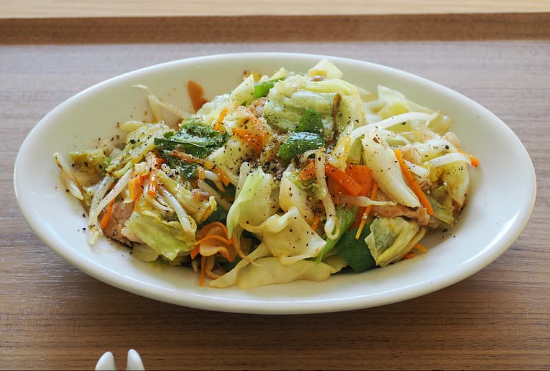 - フライパンにもやしと黒胡椒を入れてさっと炒める