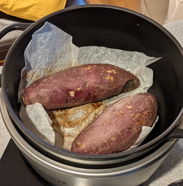 - 人参とジャガイモを容器に入れて、水を大さじ1と塩2つまみをふる