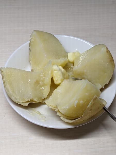 ※少々硬いとろこがあっても食べられはしますが、中まで蒸せていた方がおいしいです。 - 皮を割かないようにじゃがいもを十字に割って皿に盛り付け、バターを置いて出来上がり。塩加減はお好みで。